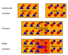 • o parte din electronii liberi ai regiunii n (aflați în zona de vecinătate), difuzează în regiunea p, unde se recombină cu golurile.