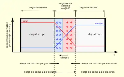 Figura A. O joncțiune p–n în echilibru termic cu tensiune de polarizare zero aplicată. Concentrațiile de electroni și goluri sunt ilustrate cu linii albastre și, respectiv, roșii. Regiunile gri sunt neutre electric. Zona roșu deschis este încărcată pozitiv. Zona albastru deschis este încărcată negativ. Câmpul electric este afișat în partea de jos, forța electrostatică asupra electronilor și golurilor și direcția în care difuzia tinde să miște electronii și golurile. (Curbele de concentraţie logaritmice ar trebui să fie de fapt mai netede, cu panta variind în funcție de intensitatea câmpului.)