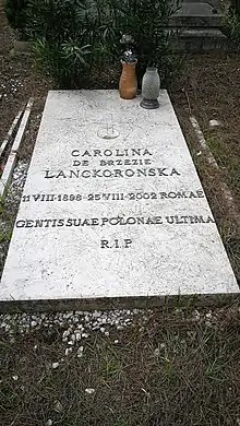 Contesa Karolina Lanckorońska a murit în 2002 la Roma (Italia), la vârsta de 104 ani, și a fost înmormântată la Campo Verano. Locul ei final de odihnă este situat în cartierul 38 (numit și cartierul străinilor - riquadro stranieri) din sectorul XIX Vecchio Reparto.