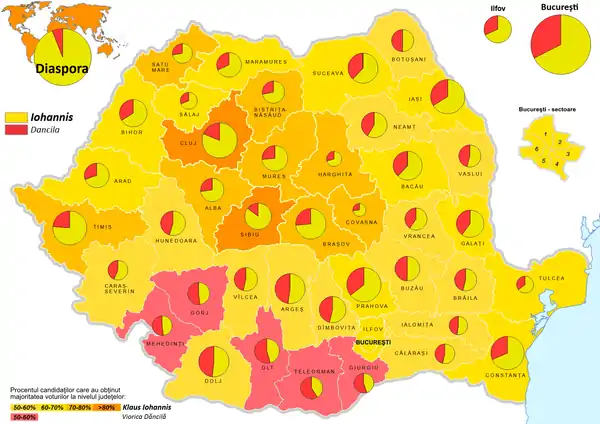 Al doilea tur de scrutin s-a desfășurat în data de 16 noiembrie 2014. Deși sondajele de opinie efectuate la ieșirea de la urne indicau un scor strâns,[69] Iohannis a câștigat detașat, obținând 54,43% din voturi.[70]