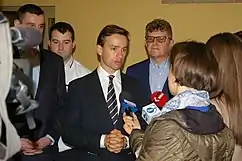 Krzysztof Bosak dând un interviu la Kielce (27 septembrie 2019)