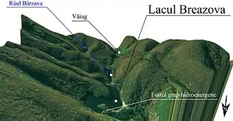 Lacul Breazova este situat la 3 km în aval de localitatea Văliug, la o altitudine medie de 500 m. [1] Se află la 14 km în amonte de Lacul Secu, lângă Lacul Văliug, cu o suprafață de 12 ha și cu un volum de apă de aproximativ 1.230.000 mc.