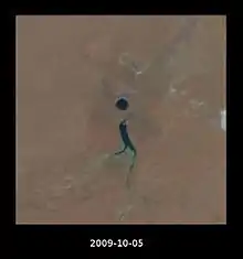 ![]() Imagine din satelit a lacului Chagan (craterul circular) și a rezervorului său în octombrie 2009 | |