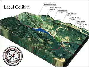 Lacul Colibița are suprafața de 270 ha, lungimea de 13 km și volumul de 65 mil m3 fiind situat la o altitudine de 900 m. Pe malurile lacului se află stațiunea turistică Colibița.[3][4]