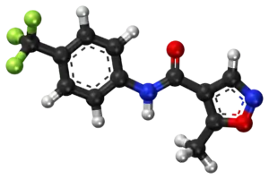 Leflunomida este un medicament antireumatic modificator al bolii și un imunosupresiv derivat de izoxazol, fiind utilizat în tratamentul artritei reumatoide și al artritei psoriazice.[10][11][12][13] Este un inhibitor al sintezei de pirimidine, acționând prin inhibarea dihidroorotat-dehidrogenazei.[14] Calea de administrare disponibilă este cea orală.[10]