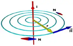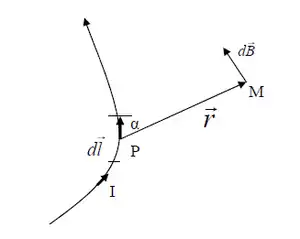 Într-un punct M, la o distanță de un element de conductor de lungime dl străbătut de un curent de intensitate I apare un câmp de inducție magnetică: