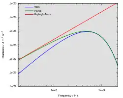 Comparație între Legea Rayleigh–Jeans, aproximația lui Wien și formula lui Planck pentru un corp la temperatura de 8 mK.