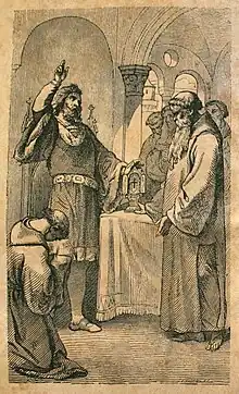![]() Leopold al V-lea primind steagul roșu-alb-roșu de la Henric al VI-lea (arborele genealogic al familiei Babenberg, Mănăstirea Klosterneuburg) | |