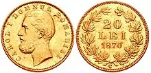 În 1868, s-a emis prima monedă românească de aur cu valoarea nominală de 20 lei, într-un tiraj de doar 200 de exemplare, aceasta fiind considerată drept probă. Începând cu 1870 s-au emis și monede de argint cu valori nominale de 50 de bani (denumite popular „băncuțe”), 1 leu și 2 lei. Începând cu 1880 s-au emis și monede de argint de 5 lei. Monede din aur pentru circulație s-au bătut în 1883 și 1890.