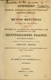 - Specimen florae Americae Septentrionalis Cryptogamicae; sistens: Muscos hepaticos huc usque in Am. Sept. Observatos, Editura Raleigh, Printed by J. Gales, Salem 1821