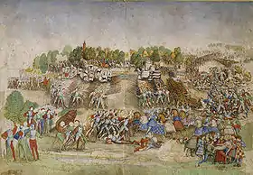 Între timp, corpul principal de armată al francezilor, condus personal de Francisc I, s-a confruntat cu elvețienii în celebra bătălie de la Marignano(en)[traduceți] (13 septembrie 1515). Inițial, elvețienii au avut inițiativa, avansând la centrul liniei de bătălie, dar superioritatea cavaleriei și artileriei franceze, coroborată cu sosirea în timp util a corpului de oaste venețian al lui Alviano (care reușise să evite armata spaniolă a lui Cardona la Verona) în dimineața zilei de 14 septembrie, a dus la o victorie decisivă pentru Francisc I și aliații săi venețieni.[23][24]