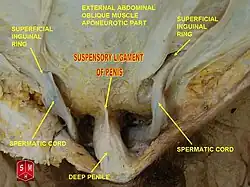 La bărbați, ligamentul suspensor al penisului este atașat de simfiza pubiană, care ține penisul apropiat de osul pubian și îl susține atunci când este erect.