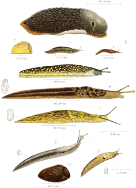 | Diverse specii de limacși: Arion ater, Kerry slug, Limax maximus și Limax flavus | |