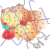 Aria de răspândire a limbii macedonene; cu albastru zonele în care macedoneana nu este recunoscută ca limbă minoritară. | |