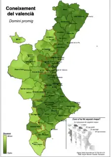 Cunoașterea limbii valenciene conform recensământului din 2001. Rețineți că zonele de culoare verde deschis din interiorul țării și din partea sudică nu sunt istoric vorbitoare de valenciană (mare).