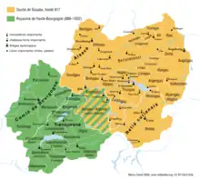 Atunci când s-au așezat în vestul teritoriului, în anul 443, burgunzii cunoșteau deja latina. Unii dintre ei erau bilingvi și se puteau exprima în latina vulgară[10]. Abandonând apoi limba lor de origine, evoluată din germanica orientală ulterior dispărută, au adoptat latina locală, care a evoluat treptat la limba francoprovensală, înlocuită mai apoi în mare parte de franceză, deși se mai vorbește încă și francoprovensala în câteva comune din Elveția franceză.