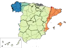 - Limba catalană/valenciană/baleară - în Catalonia, Valencia, Insulele Baleare. Mai este vorbită și in zone din estul provinciei Aragon, fără statut oficial.
