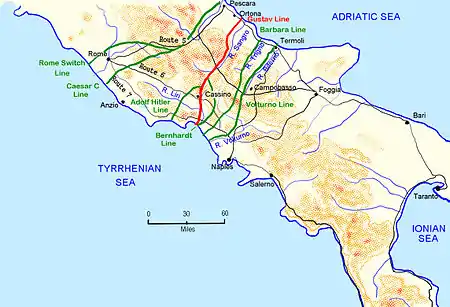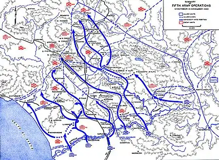 Pe coasta Mării Tireniene, Armata a 5-a SUA a atacat peste râul Volturno în noaptea de 12 octombrie.[5] Germanii au folosit cu înțelepciune terenul care favoriza defensiva și au reușit să întârzie atacul aliat până pe 2 noiembrie, când aliații i-au împins pe germani pe noua linie de apărare a acestira – Linia Barbara.