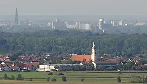 în față dreapta biserica catolică Sf. Jakobus din Schutterwald (Germania), iar în spate stânga Notre-Dame din Strasbourg (Franța)