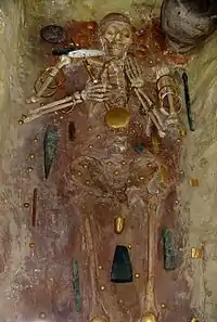 - 38.000 - 32.000 de ani: cultura châtelperroniana[13]; unelte sub forma de vârfuri realizate de ultimii neanderthalieni, dezvoltarea bijuteriilor și a ornamentelor (colierul de la Arcy-sur-Cure, Yonne), evoluția tehnicii construirii locuintelor, utilizarea ocrului ca pigment