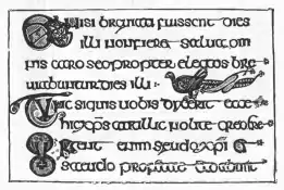 Irlandezii au devenit pe deplin alfabetizați odată cu apariția creștinismului în secolul al V-lea. Anterior, pentru inscripții era folosit un sistem simplu de scriere cunoscut sub numele de „ogham”. Aceste inscripții erau în mare parte simple declarații de tipul „x fiul lui y”. Introducerea limbii latine a determinat adaptarea alfabetului latin la limba irlandeză și apariția unei mici clase de alfabetizați, atât clerici cât și laici.[4][5]