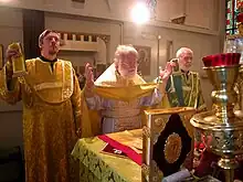 Preot însoțit de doi diaconi în timpul liturghiei Sfântului Ioan Gură de Aur