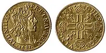 Ludovic dublu de aur, emis în 1789, 15,23 g; avers: LUD•XVI•D•G•FR•ET NAV•REX, adică: Ludovicus XVI Dei Gratia Franciae et Navarrae Rex (în română: „Ludovic al XVI-lea, cu graţia lui Dumezeu rege al Franţei şi al Navarei”; în exergă: un caduceu (simbol al meșterului monetăriei); revers: în centru: sub coroană: cele două steme ale Franței și Navarrei îngemănate; circular: CHRS•REGN•VINC•IMPER (adică, în română: „Hristos domnește, învinge, comandă”); în exergă K, semnul atelierului monetar de la Bordeaux