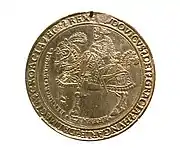 Talerul lui Ludovic al II-lea al Ungariei și Boemiei (1 1/2 taler): În centru: Regele Ludovic călare, spre stânga; circular: [L]VDOVICVS§₴DEI₴GRACIA₴HVNGARIE₴DALMACIA₴CROACIA₴EC:₴REX