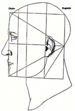 Evidenţierea raportului de aur între diversele componente ale feței umane, așa cum apare în De divina proportione.