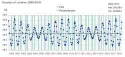 Durata lunației indicată mai sus este una medie. Durata lunațiilor variază în realitate în cursul unui an (de ordinul a ±6 ore) și chiar de la un an la altul.[2]