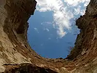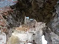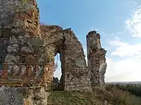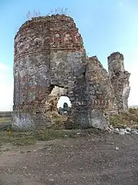 ![]() Perspectivă de la nivelul terasei inferioare asupra ruinelor bisericii | |
