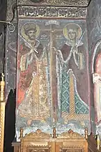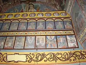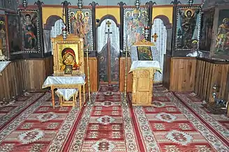 Catapeteasma este din zid și împodobită în dreapta cu icoanele împărătești ale Mântuitorului Iisus Hristos, Sfântului Ioan Botezătorul, Sfântul Gheorghe cu Sfinții Apostoli Petru si Pavel, iar în stânga cu icoanele Maicii Domnului, Sfântul Dimitrie, Sfântul Nicolae, Sfânta Parascheva[4].