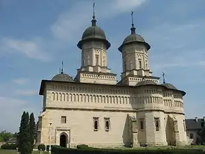 Biserica are două turle octogonale aflate deasupra pronaosului și naosului și construite pe două baze: prima pătrată și a doua stelată. Pe turle se află firide alungite, patru ferestre dreptunghiulare mici dispuse în cele patru puncte cardinale, patru contraforturi mici și trei rânduri de ocnițe (două deasupra arcadelor și unul la baza pătrată).