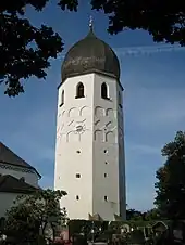 Pridvorul carolingian conservat era, probabil, deja o parte din vechea mănăstiri din perioada lui Irmingard. În corul turnului au fost găsite în 1928 picturi murale romane, peste care s-a pictat în secolul al XIII-lea. Cinci reprezentări parțial conservate ale arhanghelilor au fost expuse.