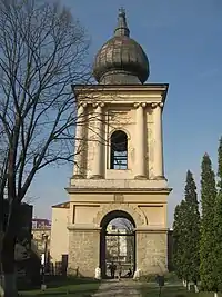 Turnul-clopotniță este încorporat în ziduri și are o serie de elemente de o frumusețe plastică aparte. Nivelul inferior este masiv, fiind străpuns de gangul intrării, deasupra sa înălțându-se camera clopotelor, ale cărei fațade sunt decorate cu coloane ionice angajate.[32] De asemenea, cupola de tablă de forma unui bulb alungit accentuează caracterul zvelt al turnului.[33]