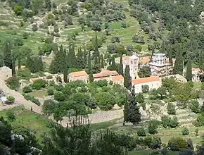 Mănăstirea este amplasată într-o vale ascunsă, la 11 km vest de Chios.