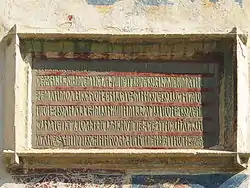 Pe peretele sudic al pridvorului, în dreapta ușii gotice, se află pisania scrisă în limba slavonă și care are următorul text: "Cu vrerea Tatălui și cu ajutorul Fiului și cu săvârșirea Sfântului Duh, iată eu robul stăpânului meu Iisus Hristos, Io Petru Voievod, cu mila lui Dumnezeu Domn al Țării Moldovei, fiul lui Ștefan Vodă cel Bătrân, a binevoit domnia mea cu buna mea voie, în al patrulea an al stăpânirii (mele) împărătești, a zidit acest hram întru numele arhiereului și făcătorului de minuni Nicolae, fiind egumen kir Grigorie, în anul 7038 oct(ombrie) 16." (1530).