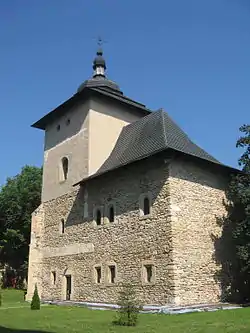 Pe latura estică se află trei turnuri pătrate (două la colțuri și unul în mijloc) legate între ele printr-un drum de strajă. Turnul de pe mijlocul laturii estice servește și ca poartă de intrare în incinta mănăstirească. Pe zidul exterior se află un tablou votiv destul de șters reprezentând pe Petru Rareș cu familia sa, iar dedesubt o stemă moldovenească cu următoarea pisanie: "Această mănăstire a făcut-o Io Petru Voievod, la anul 7038 și s-au îngrădit după moartea lui de Doamna Elena și copiii ei Io Iliaș Voievod și Ștefan și Constantin, la anul 7058 septembrie 4" (1530, 1550).[8]