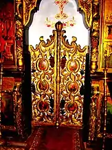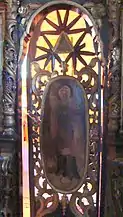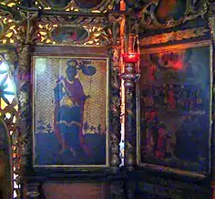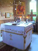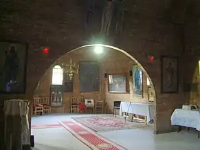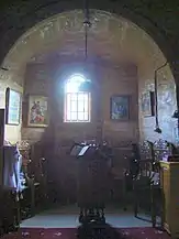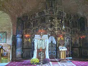 Naosul are două abside laterale largi, este luminat de o fereastră la sud și alta la nord și se delimitează de pronaos printr-un perete de scândură, cu o deschidere largă. Pronaosul este luminat de o fereastră la vest și alta la nord. Toate ferestrele sunt din lemn, dreptunghiulare, terminate în arc și întărite cu grilaje de metal. Pridvorul din lemn a fost adăugat mai târziu, în anul 1936. Are o ușă de intrare pe latura de sud, ușă în două canaturi cu geamuri în partea superioară. Interiorul bisericii nu este pictat, pereții fiind împodobiți de icoane. Lângă biserică se află crucea egumenului Avramie[3].