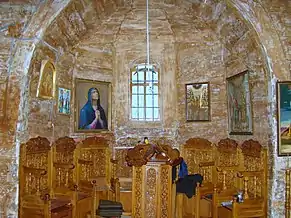Biserica mănăstirii este construită din lemn de frasin pe fundație de piatră, de meșteri locali anonimi. Este realizată în stilul clasic moldovenesc, în formă de cruce, cu o singură turlă deaspra naosului. Altarul este spațios, luminat de o fereastră la est. Catapeteasma, frumos sculptată, se înalță până la boltă și este ridicată în 1833. Pe spate se află inscripția: „Această biserică este făcută de robul lui Dumnezeu Avramie ieroschimonah, egumen și duhovnic”.