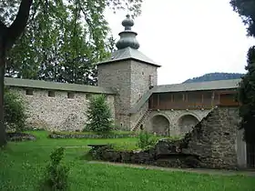 Pe latura de est, terenul era instabil, astfel încât a trebuit să fie înălțat, cu acest prilej fiind ridicat și zidul din acea parte. La mijlocul laturii de est, unde se întâlnesc cele două curtine, se află un turn cu un gang supralărgit la parter pe unde se intra în incinta fortificată. Astăzi intrarea se face pe o poartă de pe latura de vest. De ambele părți ale acestui turn, în interiorul incintei, au existat inițial două corpuri de clădiri fără etaj, având deasupra loc un drumul de strajă, prevăzut cu creneluri de apărare. Între anii 1830-1834, arhiereul Filaret Beldiman "Apamias" a refăcut din temelie turnul de poartă de pe latura de est. Turnul are coloane neoclasice angajate, pe ambele fațade și era inițial mult mai înalt, având două etaje. La etajul său se află paraclisul de iarnă cu hramurile Sf. Nicolae și Sf. Spiridon. Tot atunci au fost demolate chiliile din dreapta turnului, iar în partea stângă a fost construit un corp de chilii cu parter și etaj, având un pridvor deschis, susținut pe coloane neoclasice de lemn. Această clădire a fost utilizată ca spital.[9]