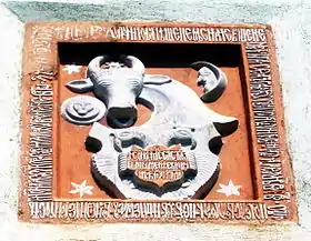 Noul egumen, ieromonahul Nil, s-a îngrijit de realizarea pisaniei, care a fost amplasată la 8 aprilie 1582 deasupra intrării în biserică. Piatra care conține pisania are formă pătrată, având în centru stema Moldovei (bourul). Inscripția în limba slavonă este săpată pe marginea pietrei și are următorul text: "Cu voia Tatălui și cu ajutorul fiului și cu săvârșirea Sfntului Duh, adică eu robul lui Dumnezeu, răposatul întru credință Alexandru Voievod cu Doamna sa Ruxandra și cu de Dumnezeu dăruitele lui odrasle: Bogdan, Ioan, Petru și Constantin, a început a zidi hram întru numele Schimbării la Față a Domnului, în anul 7069" (1561). Pe scutul stemei, stă scris cu litere mai mici următoarele: "Această piatră s-a pus în zilele egumenului Nil, în (anul) 7090 luna aprilie 8" (1582).