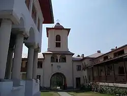 ![]() Vedere din curtea interioară a mănăstirii, cu pridvorul bisericii, chiliile și turnul clopotniță în fundal | |