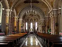 În medalioanele pictate pe suprafața bolților apar scene biblice, care au fost pictate cu ocazia unei renovări de la începutul secolului XX. În capelele laterale sunt amplasate altare și confesionale istorizante, iar sub cele două baldachine amplasate simetric pe arcul de triumf stă amvonul (la sud), opera lui János Kupcsay (1840-1910), și singura piesă a mobilierului baroc, o pictură a Mariei Protectoare de la Passau(de)[traduceți] (la nord).