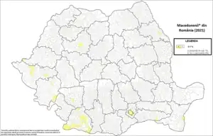 În România, la recensământul din anul 2002 s-au declarat 731 persoane drept "macedoneni", fiind înregistrați în statistici drept macedoneni slavi. De asemenea 588 persoane au declarat că limba lor maternă este macedoneană.
