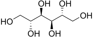 Manitolul este un alditol (alcool polihidroxilic) derivat de la manoză, care prezintă mai multe utilizări, ca îndulcitor[9] și ca medicament (în tratamentul edemului cerebral, al hipertensiunii intracraniene, al glaucomului acut, al fibrozei chistice și al constipației).[10][11][12]