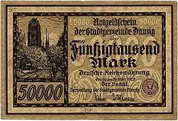 Bancnotele au fost emise de Germania în timpul Primului Război Mondial pentru a compensa lipsa de monede; din cauza hiperinflației au fost emise cupiuri cu valori tot mai mari. În 1922 bancnotele au fost emise de Senatul Danzigului.
