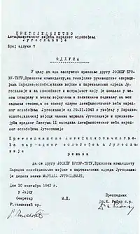 AVNOJ promovându-l pe Tito la gradul de Mareșal al Iugoslaviei