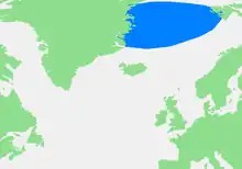 ![]() Harta Atlanticului de Nord cu Marea Groenlandei marcată în albastru | |