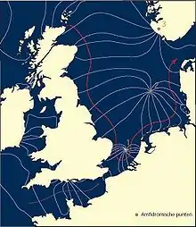 Pe de altă parte, există puncte în Marea Nordului în care amplitudinea mareelor este practic egală cu zero. Acestea se numesc puncte amfidromice (din gr. amphi: în jurul și dromos: curs), valurile mareice deplasându-se în jurul lor. Valul mareic inițial care intră în Marea Nordului dinspre nord pe lângă Scoția vine spre sud de-a lungul coastei de est a Angliei. La nord de estuarul Tamisei, însă, el nu se deplasează decât foarte încet spre sud, deoarece acolo se ciocnește cu valul mareic care intră prin Canalul Mânecii. Ca efect de interferență, rezultă un punct amfidromic la mijlocul distanței dintre Norfolk și Amsterdam. Există în total trei puncte amfidromice în Marea Nordului: la sud de Norvegia, pe Dogger Bank la 300 km nord-vest de insula Sylt, și la ieșirea din Canalul Mânecii. Acestea formează un singur câmp în jurul căruia circulă valurile mareice[10].